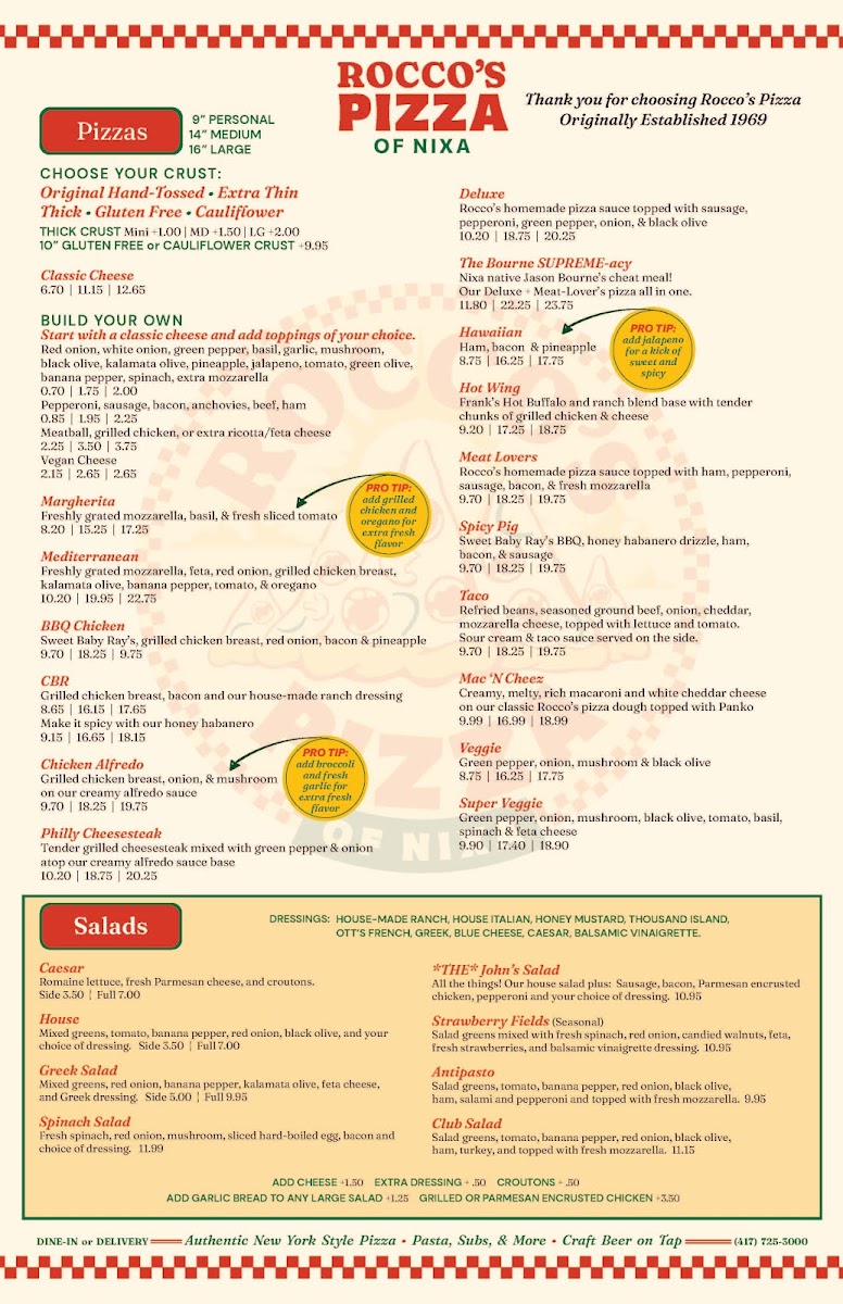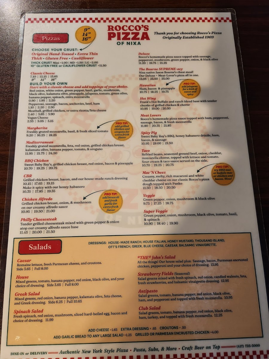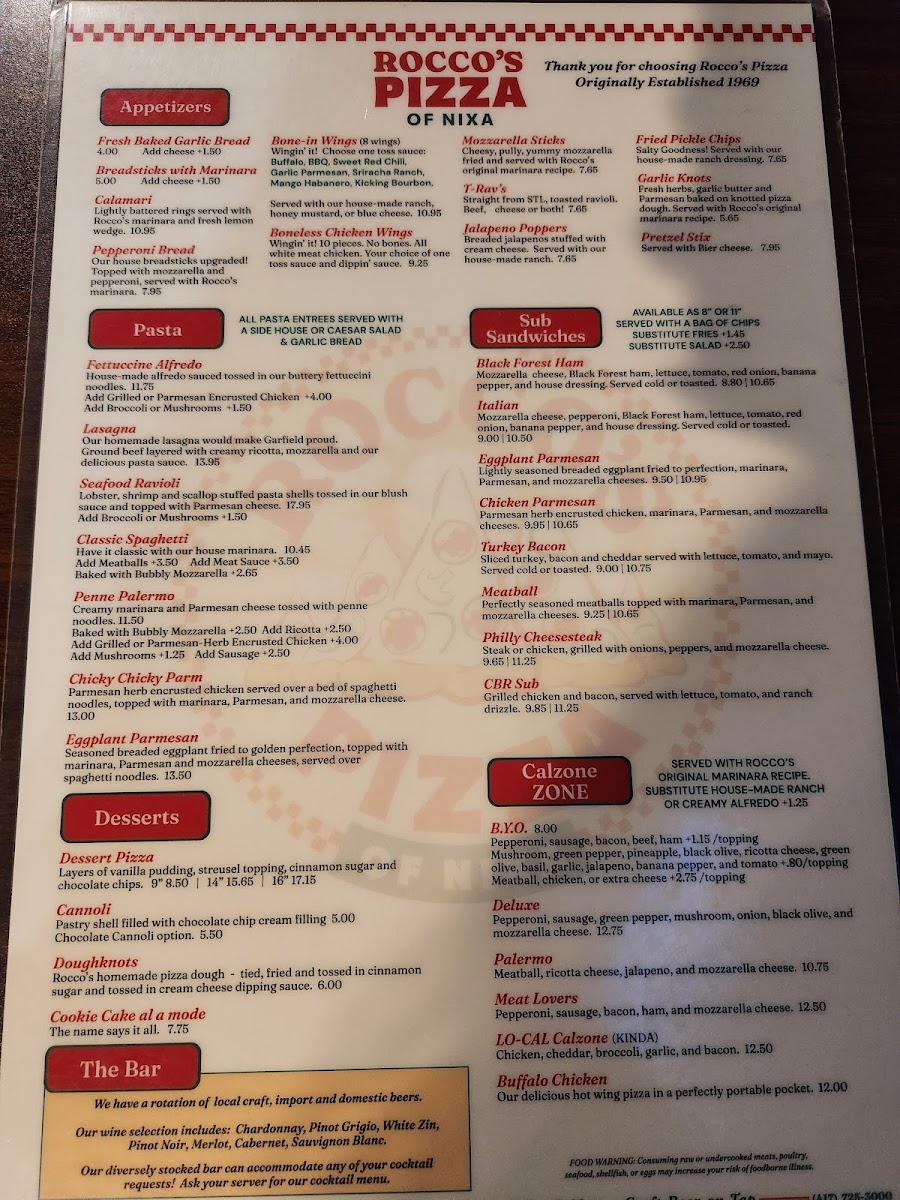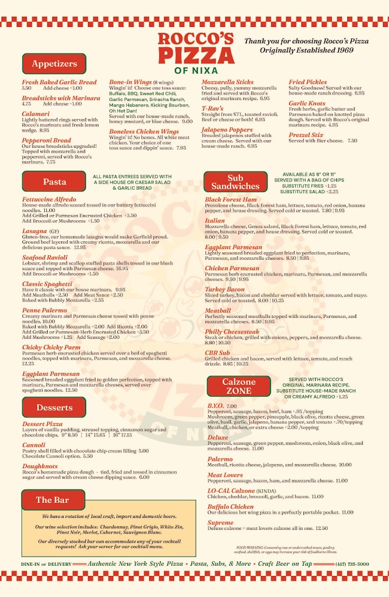 Rocco's Pizza Nixa offers a menu that balances casual, comforting Italian favorites with hearty bar-style bites. Whether you're stopping in for a relaxed lunch, gathering with friends after work, or ordering in for a cozy evening at home, the menu adapts well to many occasions. You'll find classic pizzas like pepperoni and cheese alongside more creative options such as the Taco Pizza or Meat Lovers. Fresh pasta dishes like Fettuccine Alfredo and Chicken Alfredo provide comforting, satisfying meals that pair naturally with the laid-back yet lively atmosphere.