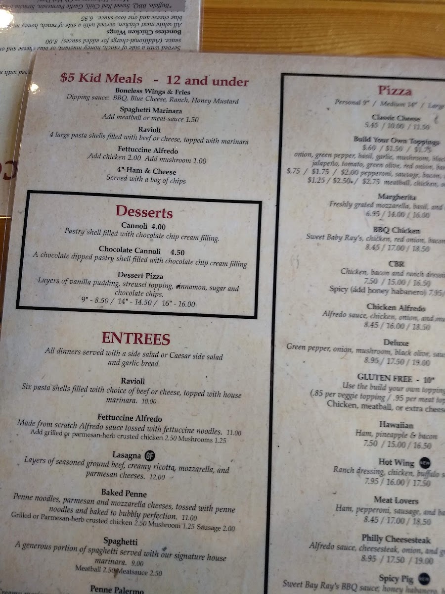 Completing the menu are lighter options like chef salads and personal-sized Margherita pizzas, as well as indulgent desserts including cannoli and dessert pizza, rounding out an experience that feels welcoming and unpretentious. The food’s approachable flavors and generous portions complement the cozy, family-friendly atmosphere and the simple pleasure of sharing a meal with others in Nixa’s downtown area.